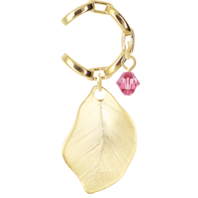 繊細なリーフモチーフに、ピンクのローズクリスタルがきらめくイヤーカフ。ゴールドの艶感と柔らかなカラーが耳元を華やかに彩ります。